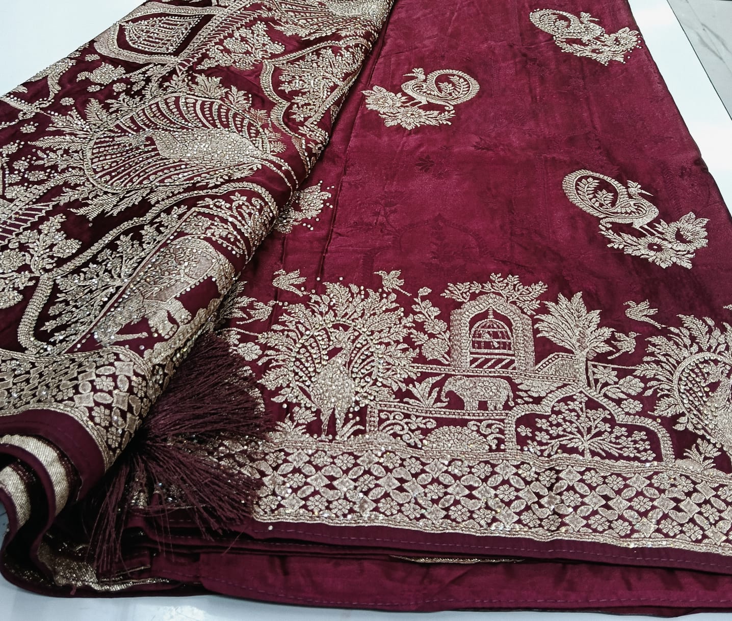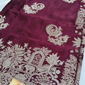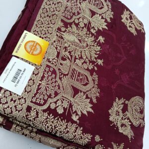 Designed with intricate woven patterns, delicate embroidery, and detailed patchwork, these sarees offer a graceful drape and festive charm. To maintain their beauty and longevity, dry clean is recommended. Store in a cool, dry place away from direct sunlight, avoid spraying perfume on the surface, and iron on low heat with a protective cloth, especially over embellished areas.