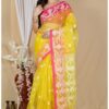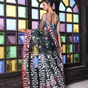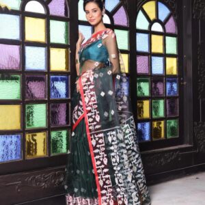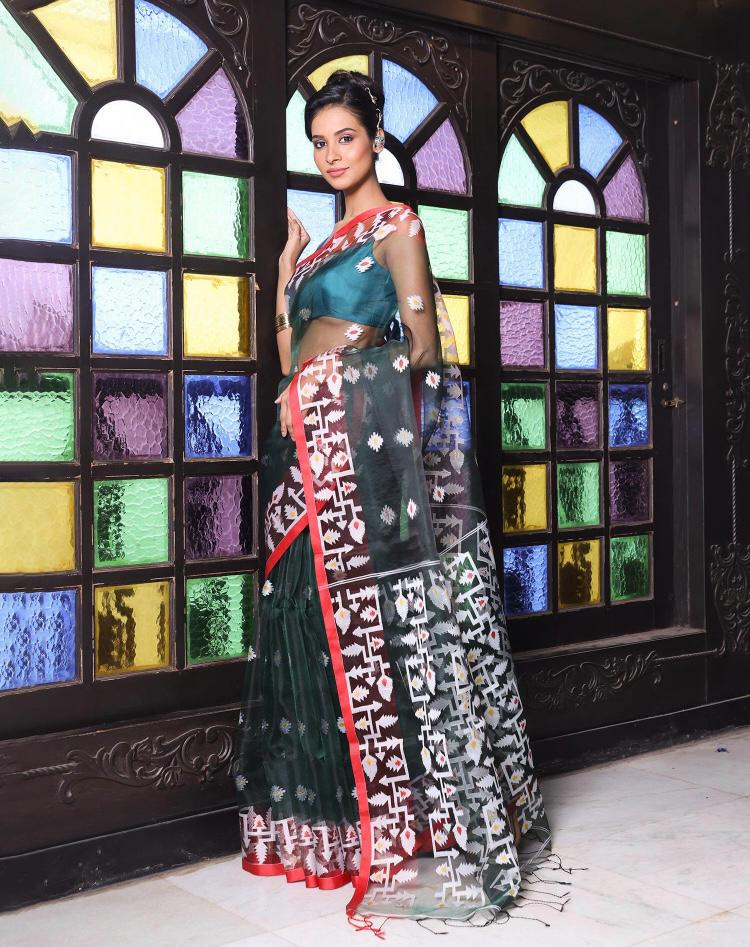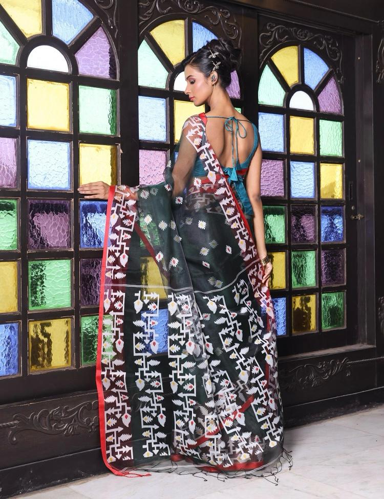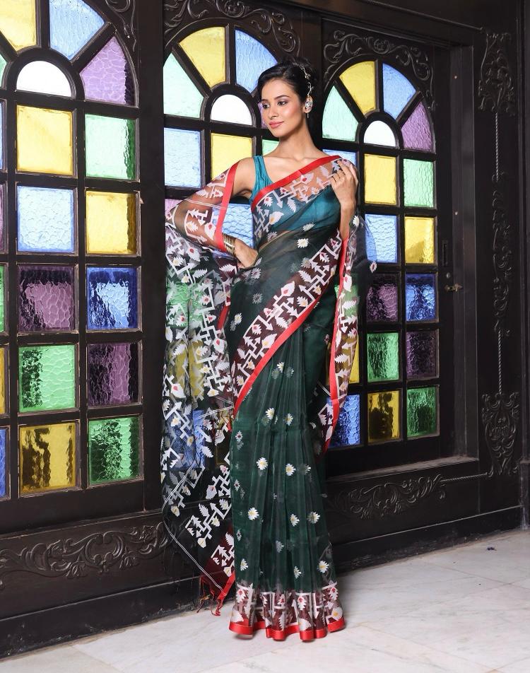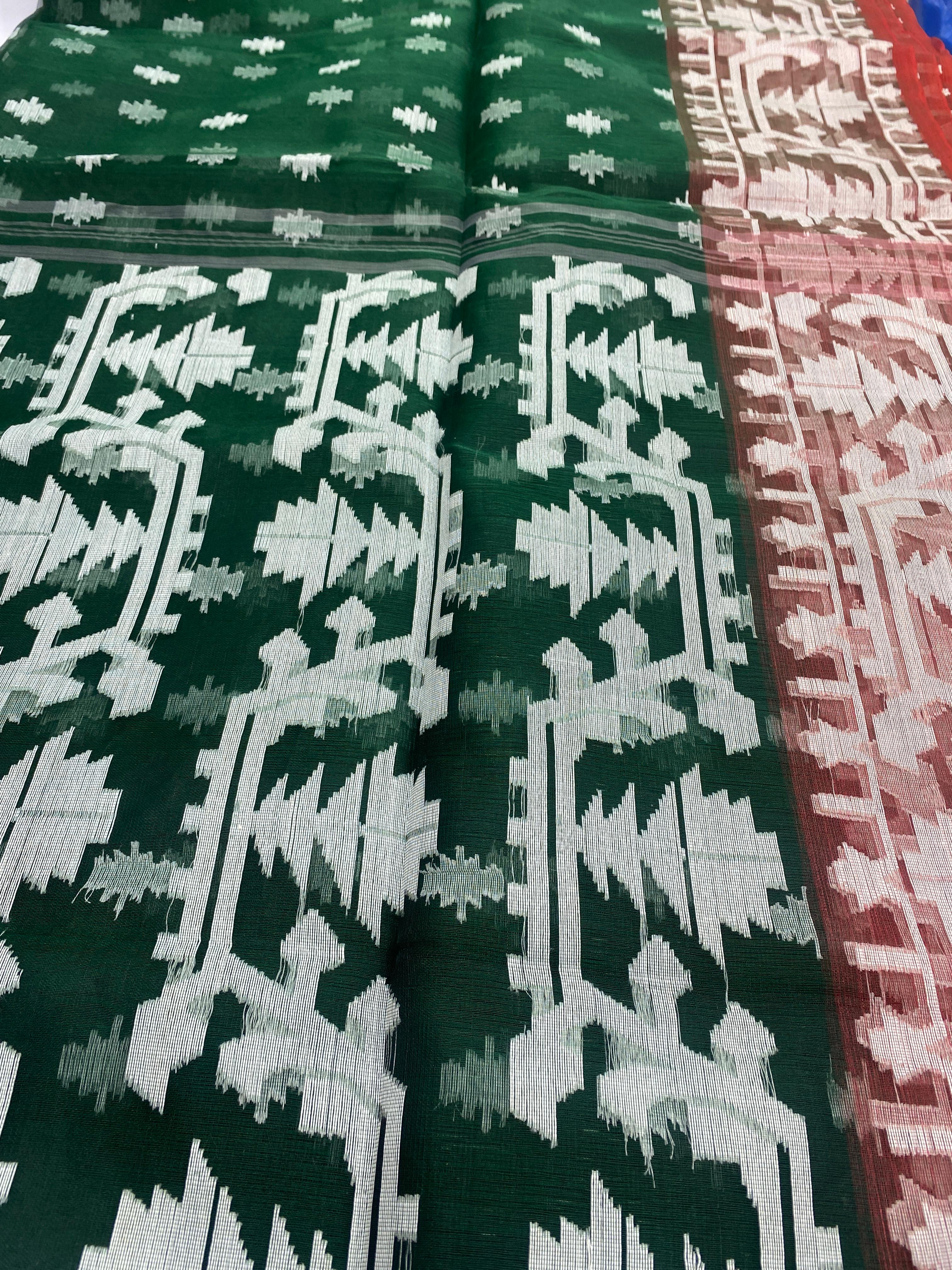 Dark Green Muslin Jamdani Design Saree with Unstitched Blouse