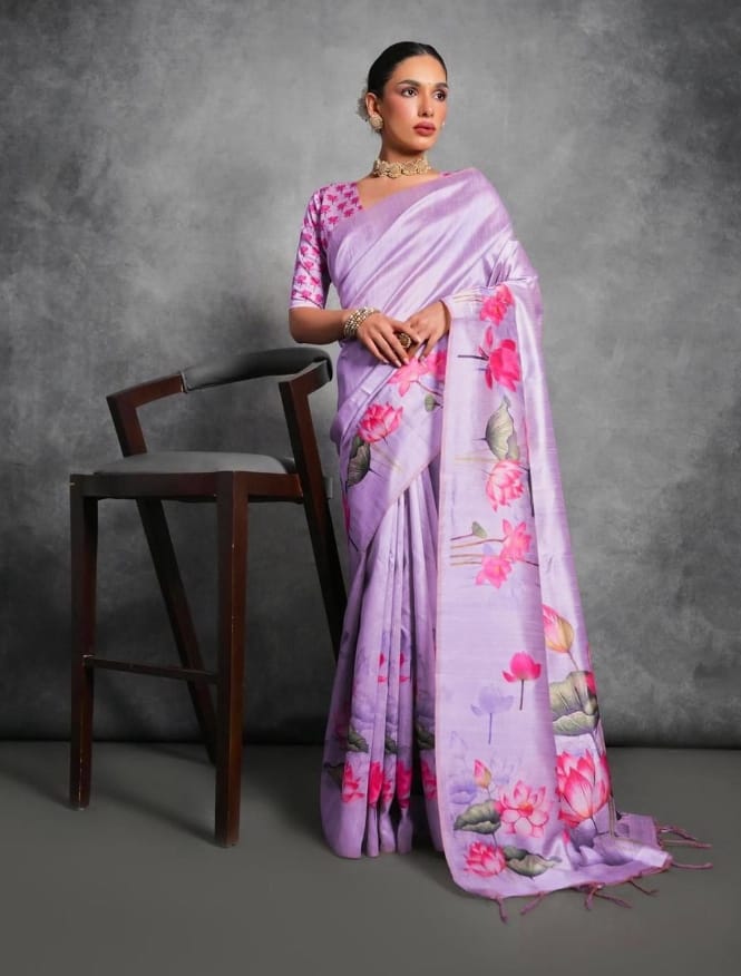 Lavender Lotus Print Tussar Saree with Unstitched Blouse