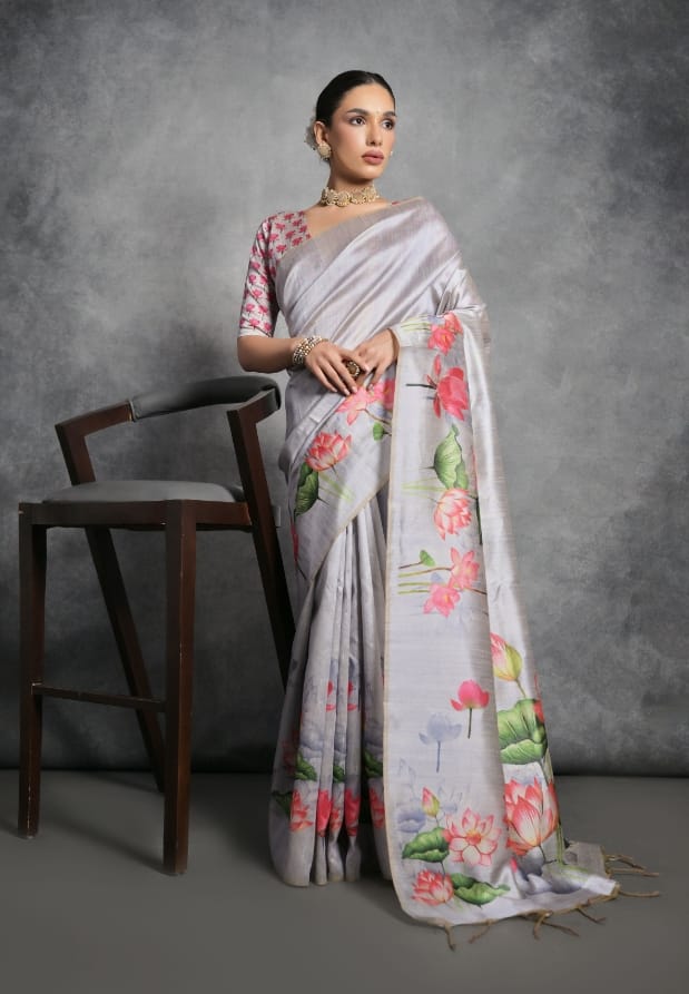 Light Blue Lotus Print Tussar Saree with Unstitched Blouse