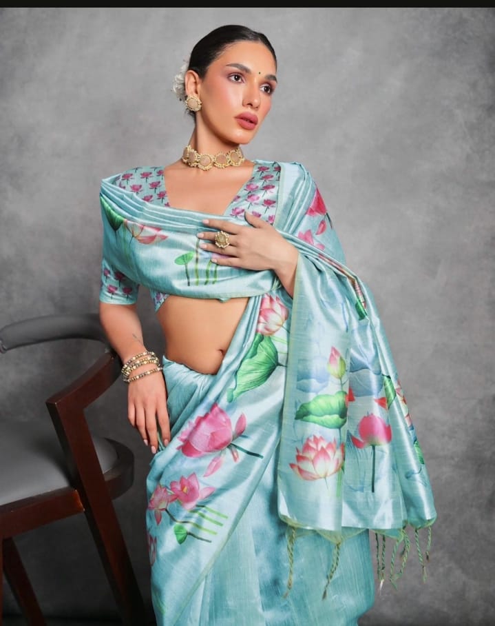 Ocean Blue Lotus Floral Print Saree with Unstitched Blouse