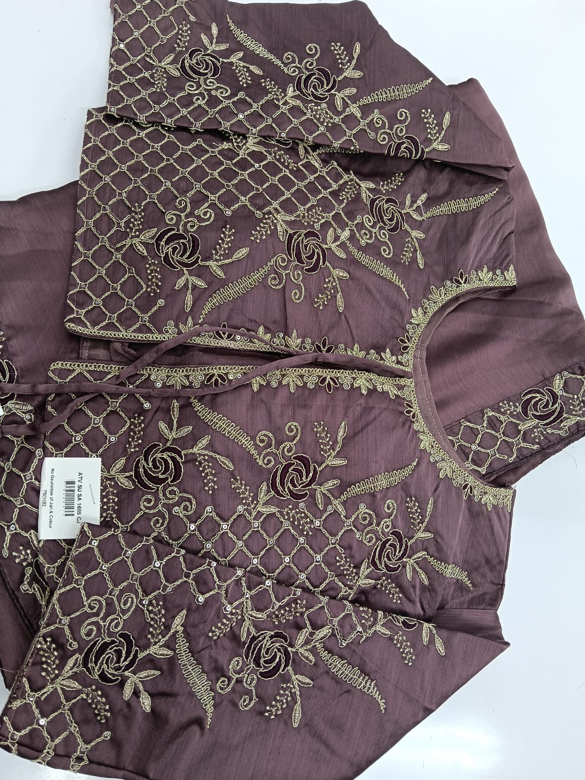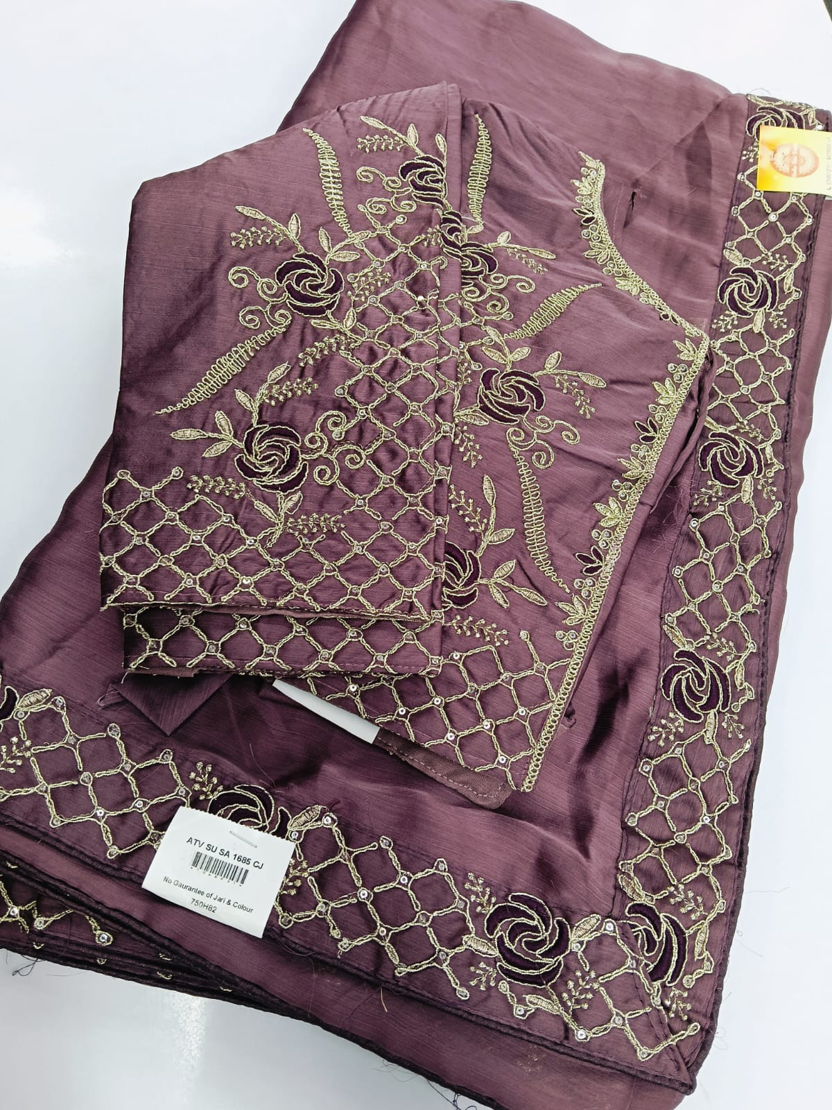 Onion Pink saree with embroidery border works is paired up with floral blouse having embroidery works for sleeves.