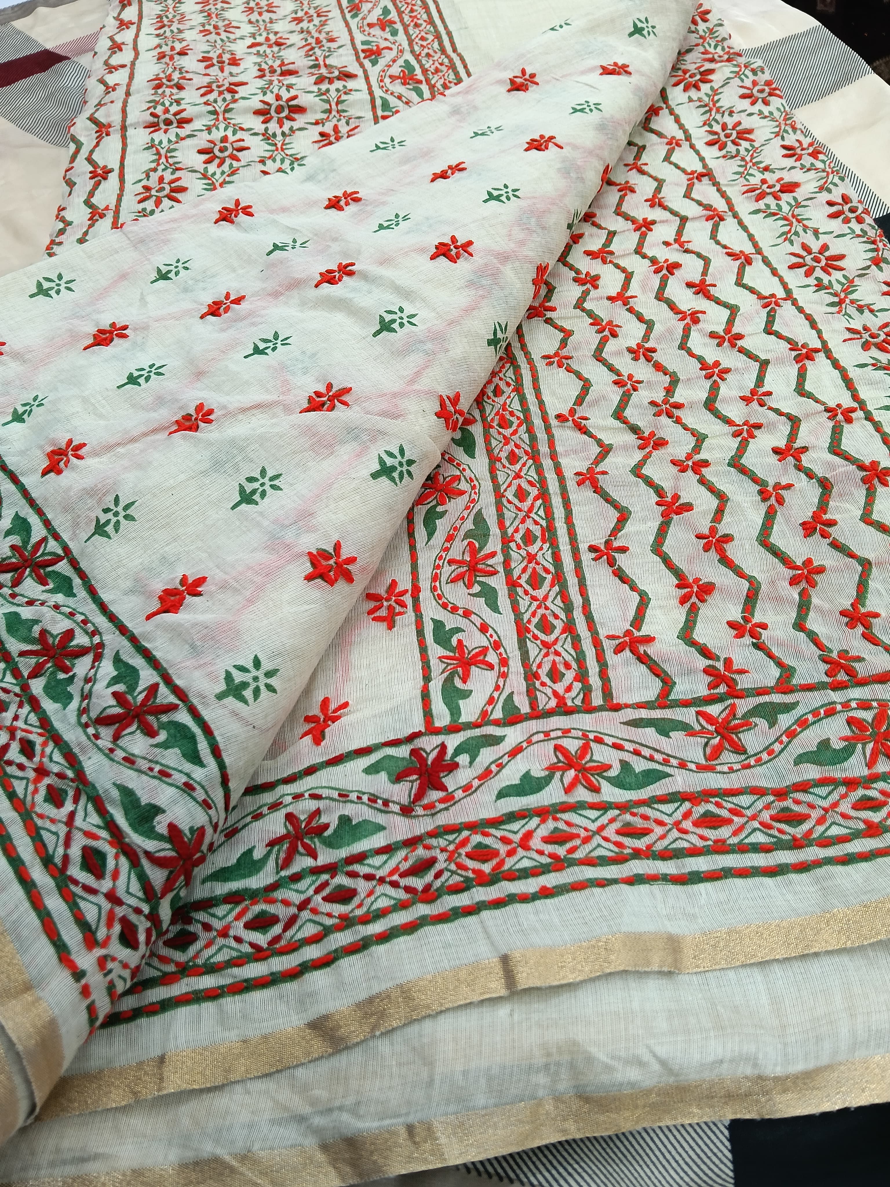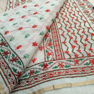 Premium Traditional Orange colour Kantha Stitch Saree with Unstitched Blouse