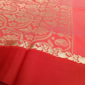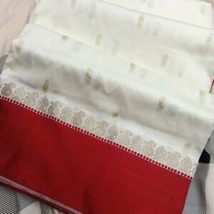 Exquisite White & red ‘garad’ silk saree; self-colour kalka woven border; with blouse piece. Made from high-quality silk and intricately woven with a self-colour kalka border, this exquisite White & red ‘garad’ silk saree is a must-have for any wardrobe. Experience the unmatched elegance and style of this traditional saree, perfect for any occasion.