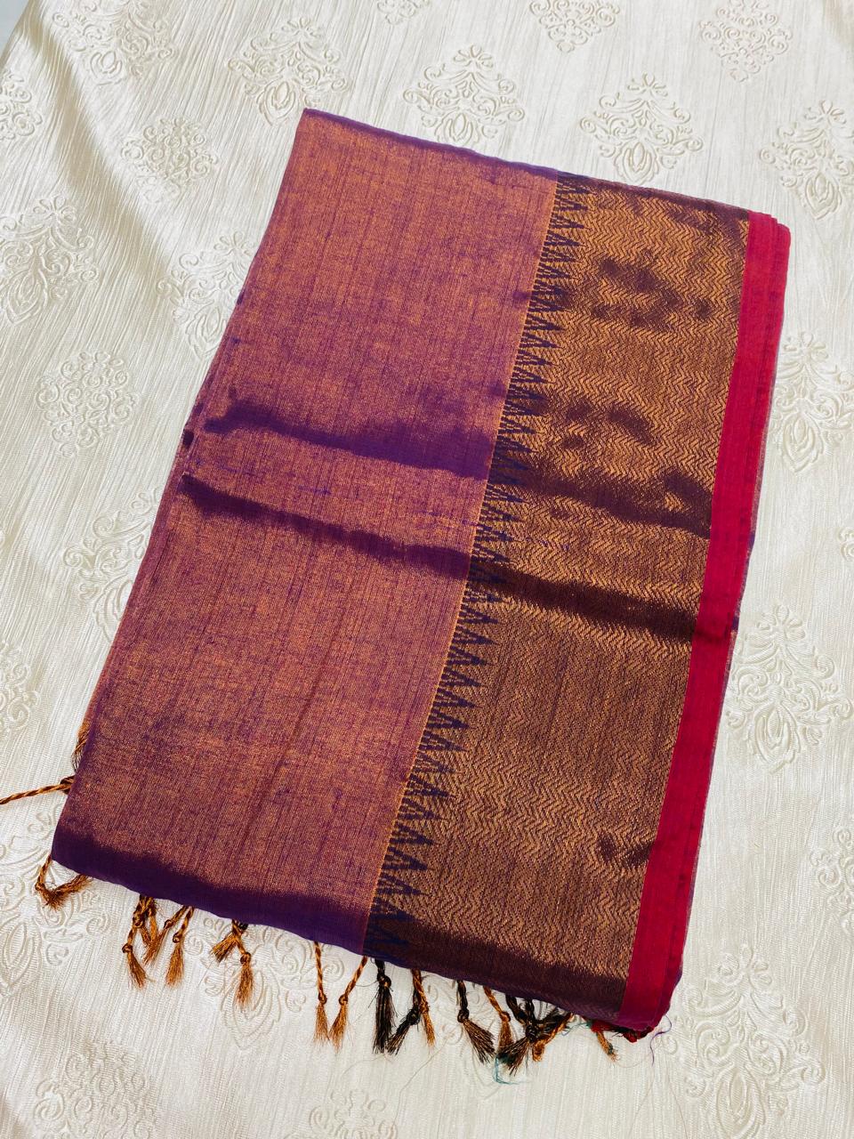 Curate an impeccable look by donning this handloom saree from Radha Rani Trends. It is crafted from high-quality khadi material, this saree comes with an unstitched blouse piece. Team up this beautiful saree with embroidered wedges and a clutch to complete the look.
