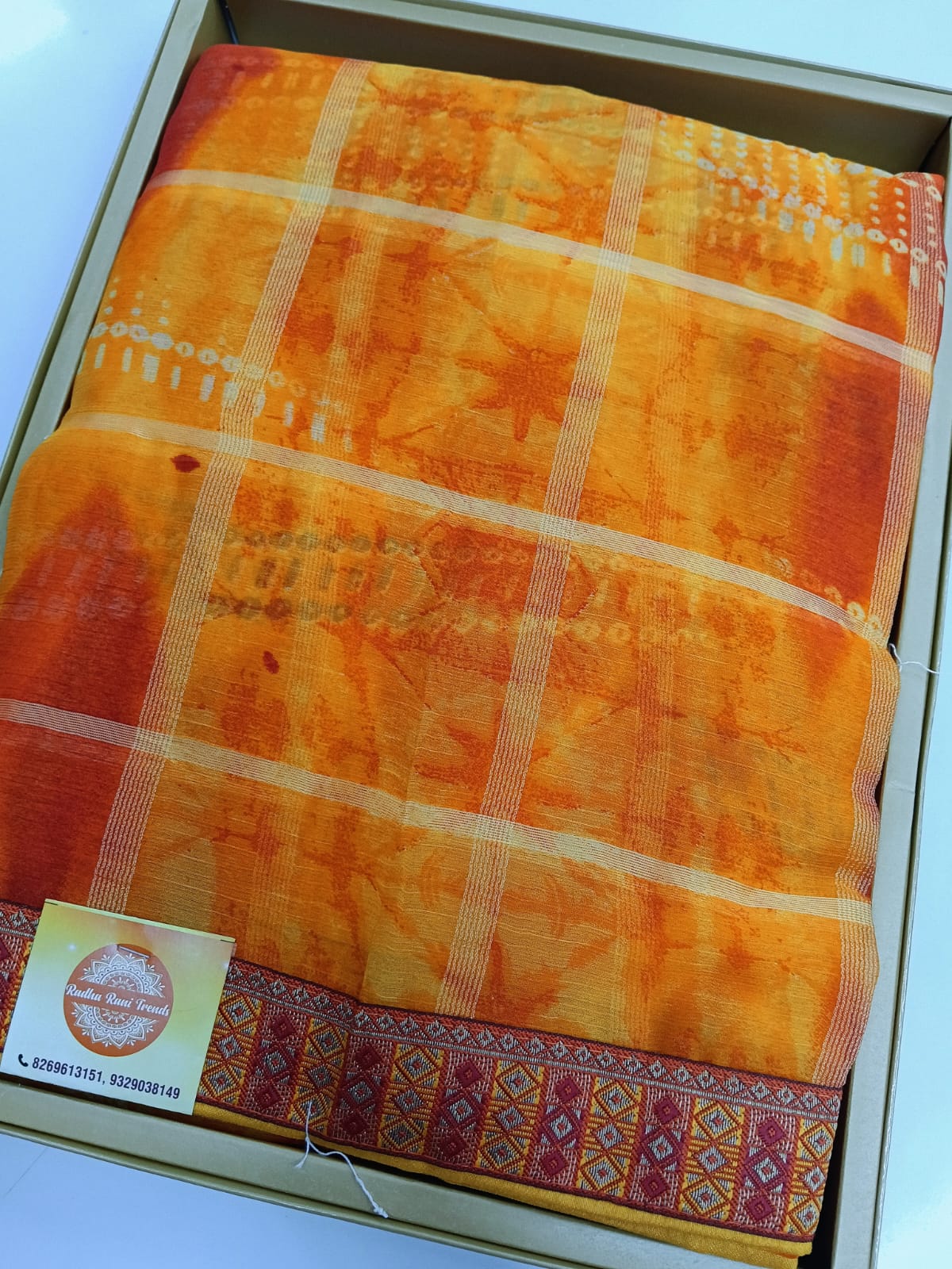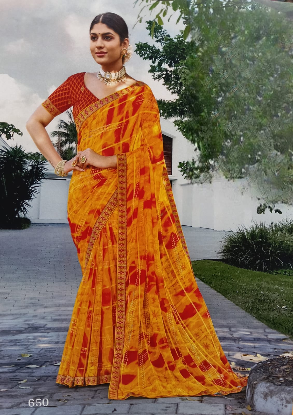 Ramrasiya Bandhani Print Georgette Saree up your style game with this Yellow saree from Ramrasiya Brand is Crafted in the finest material, this beautiful piece is a must-have for your wardrobe. Style it with a pendant necklace and heels to complete the look.