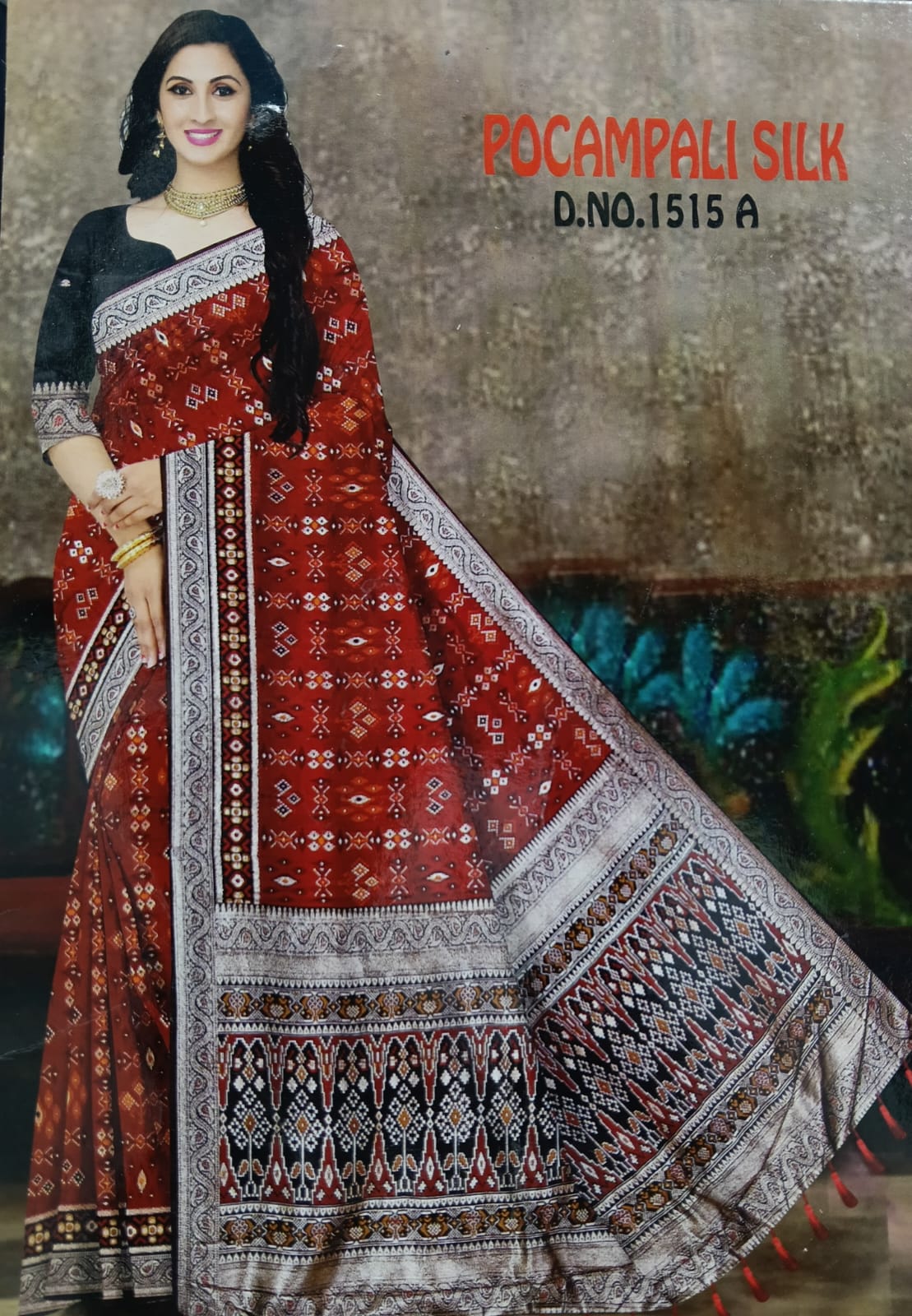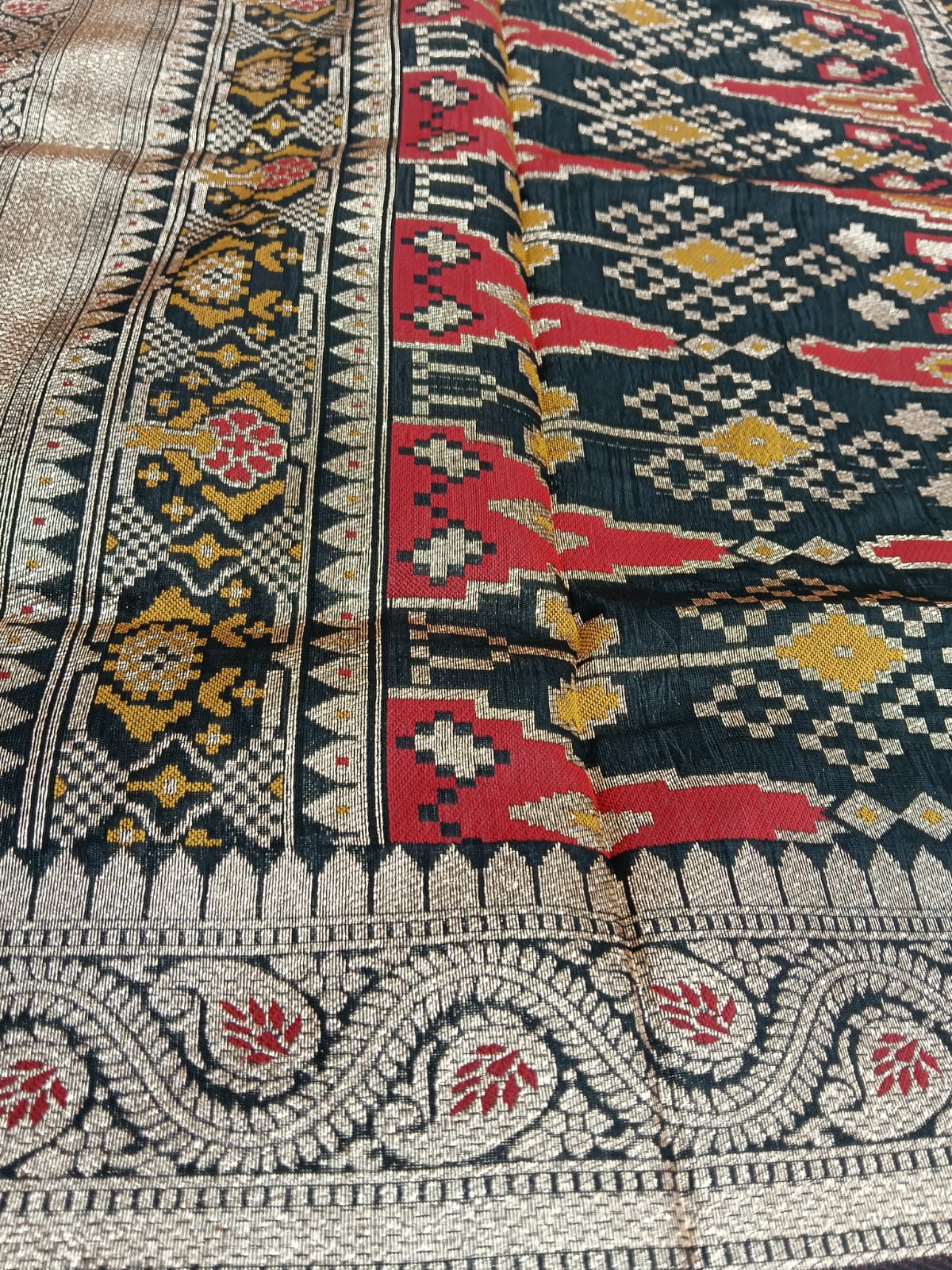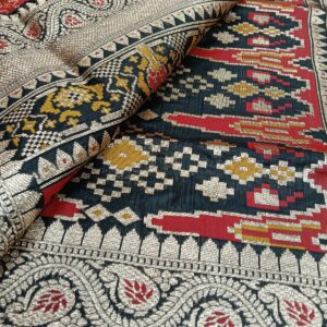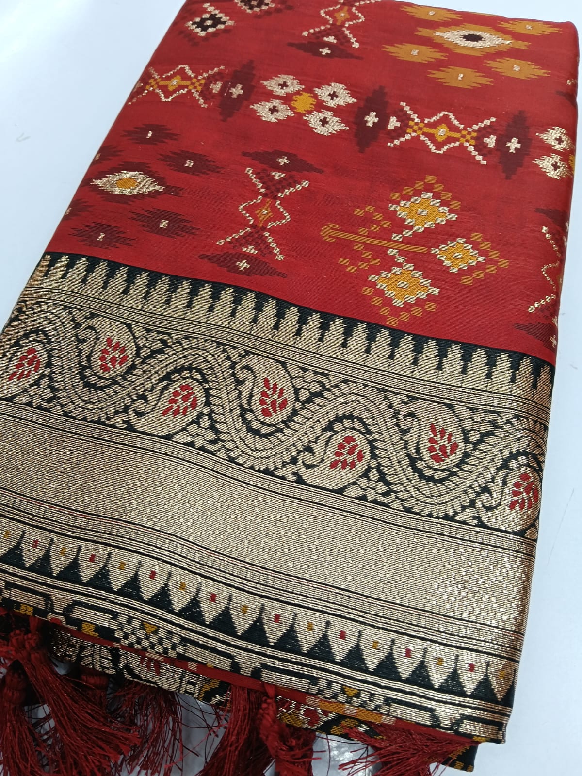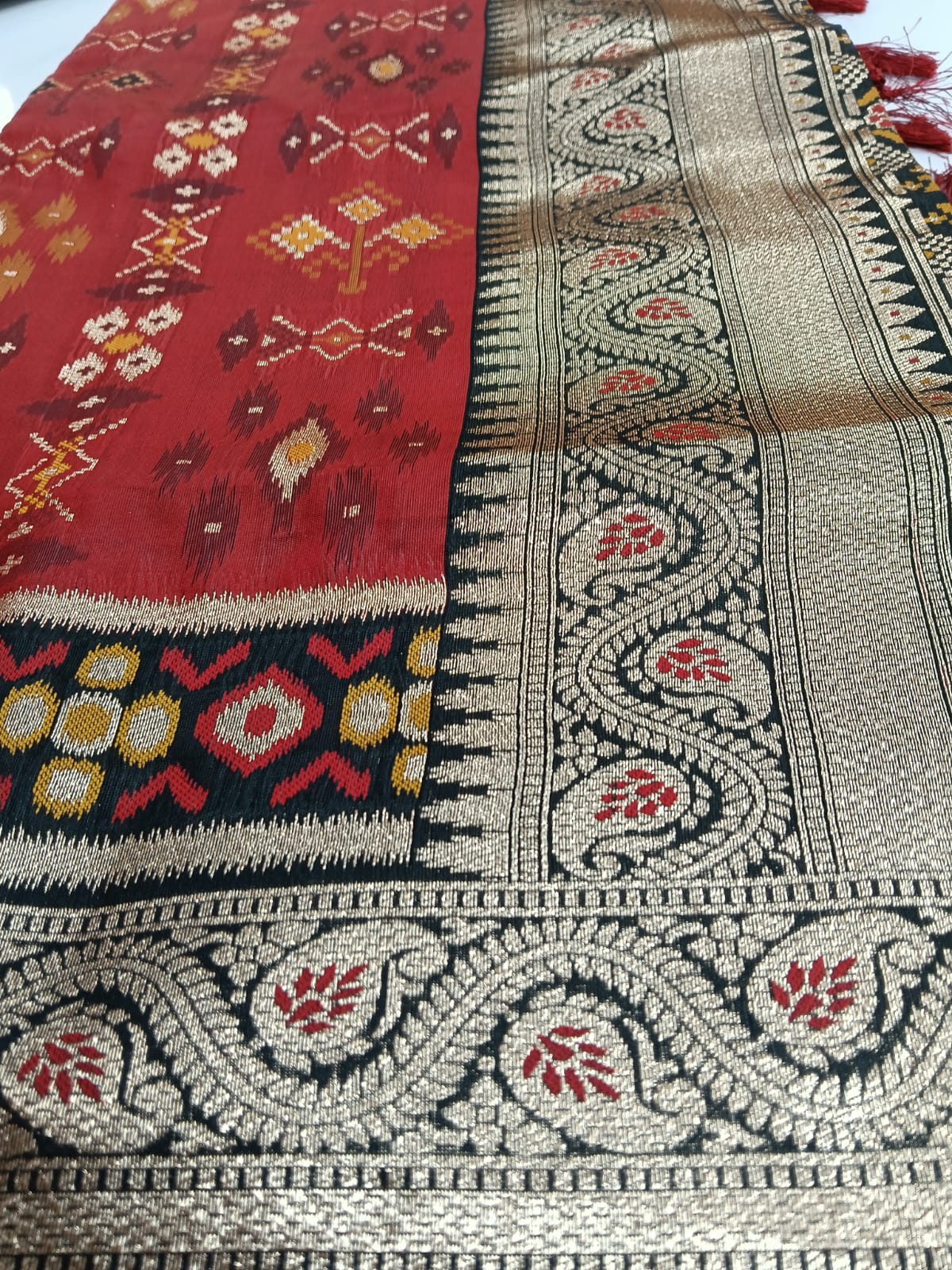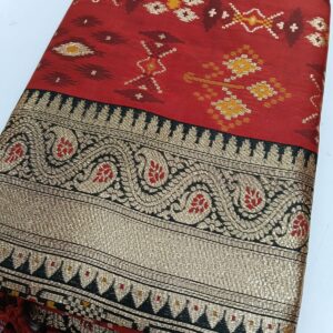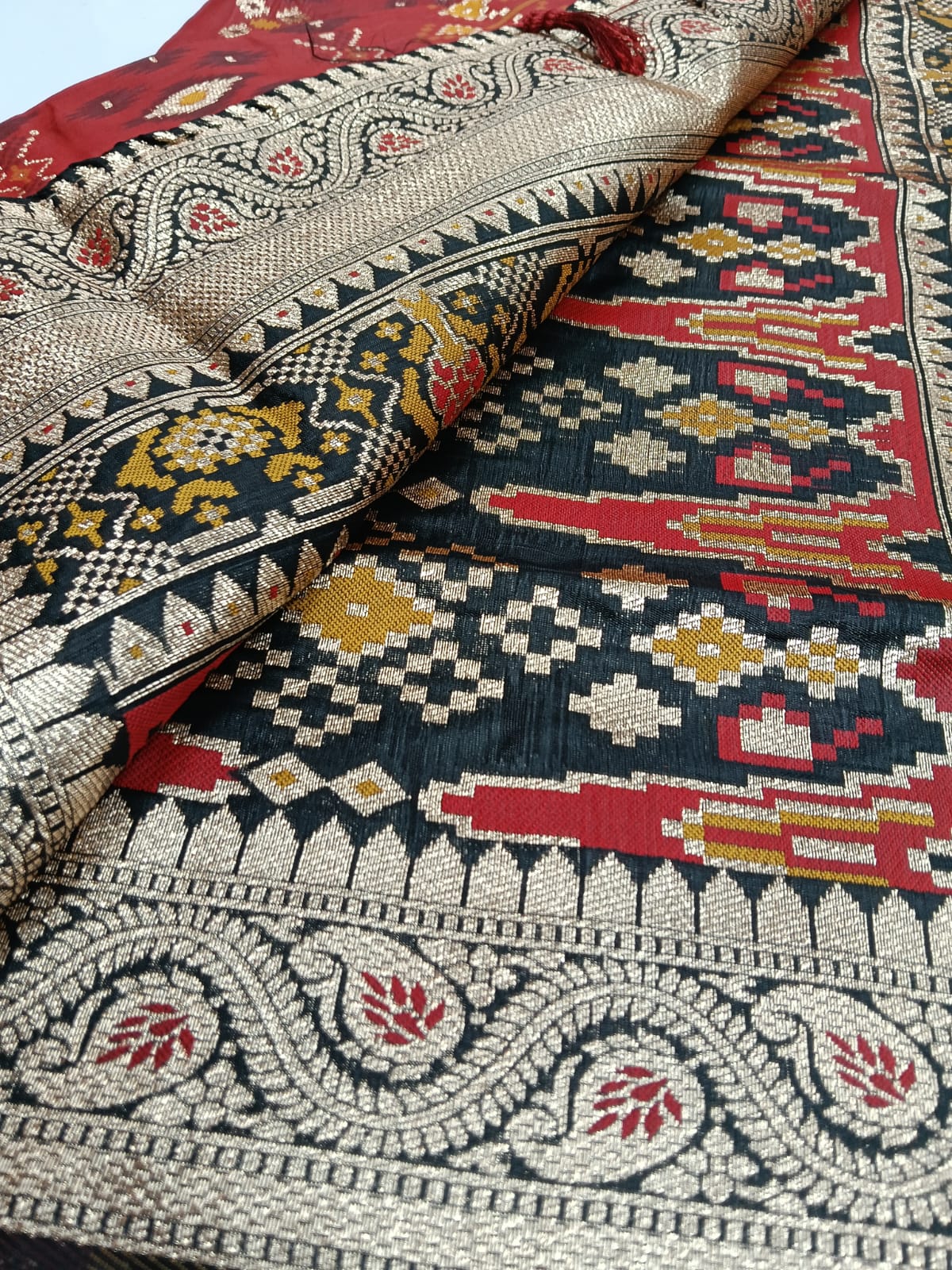 Make a fashion statement with this Red black silk saree from Radha Rani Trends. Crafted from silk blend, this beautiful saree is the perfect embodiment of tradition meets modern. Style it with a pair of heels and statement Jewelry.