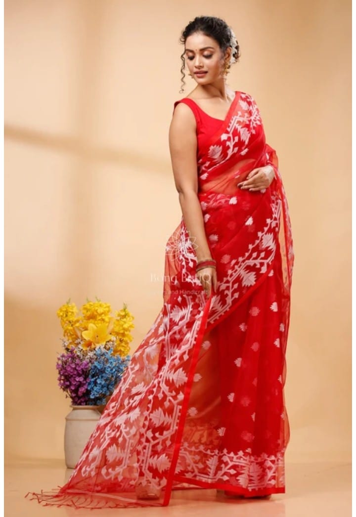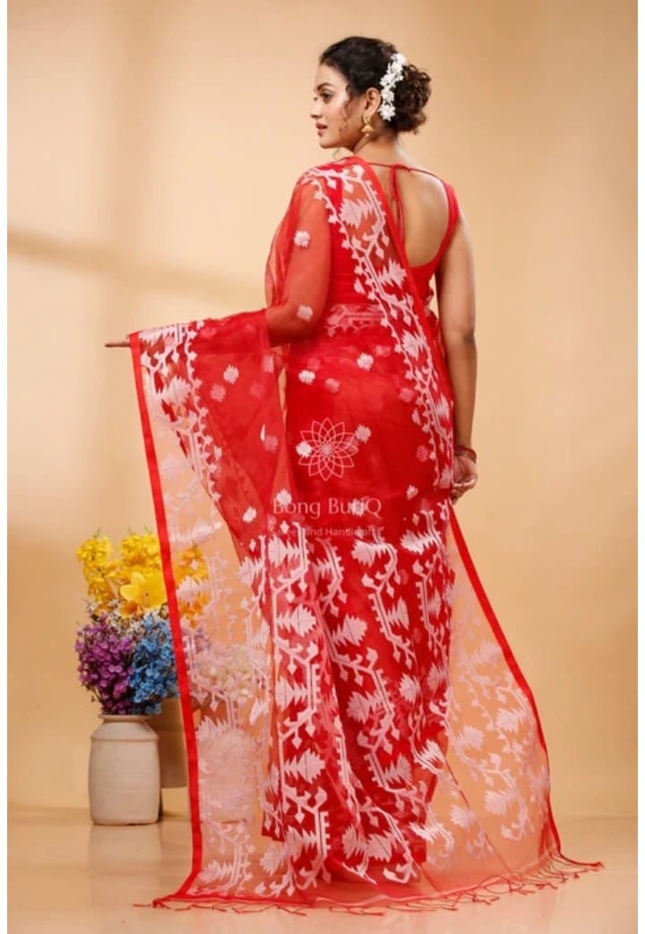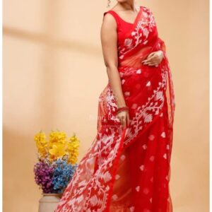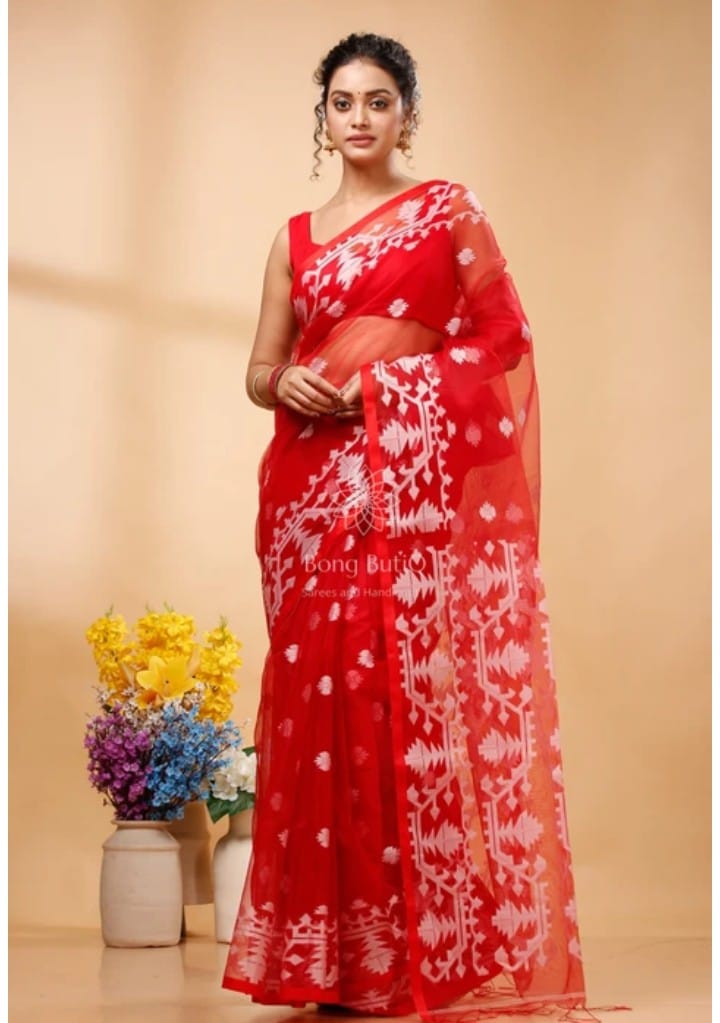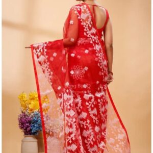 Red Muslin Jamdani Design Saree with Unstitched Blouse