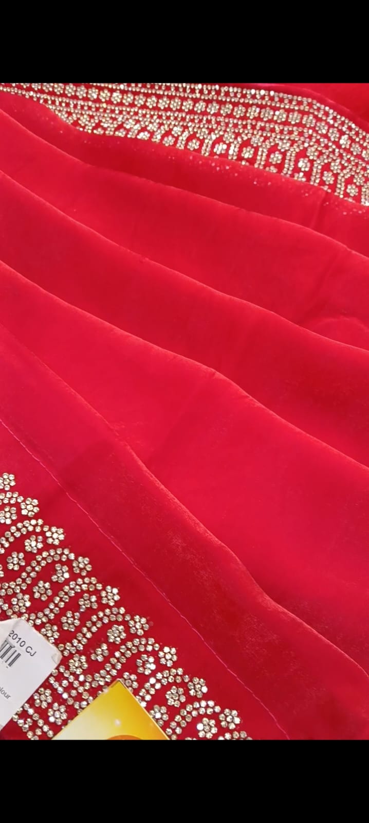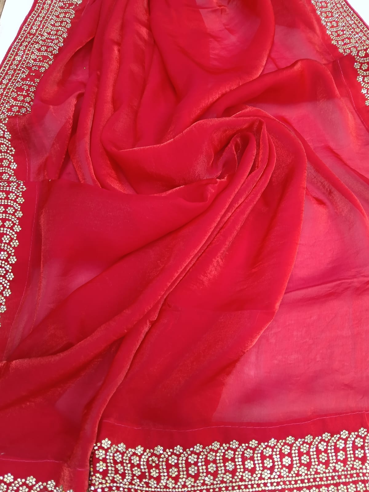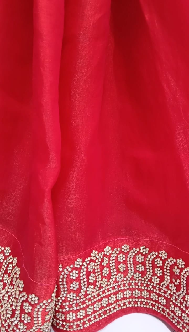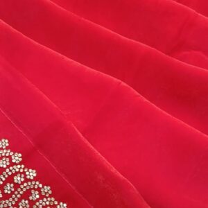 This red saree from the house of Radharani Trends is trendy and stylish. Match blouse according to your taste and preference. This saree is crafted by skill craftsmen without compromising on its quality. With this beautiful design and fabric, this saree will fetch you oodles of compliments and praise.