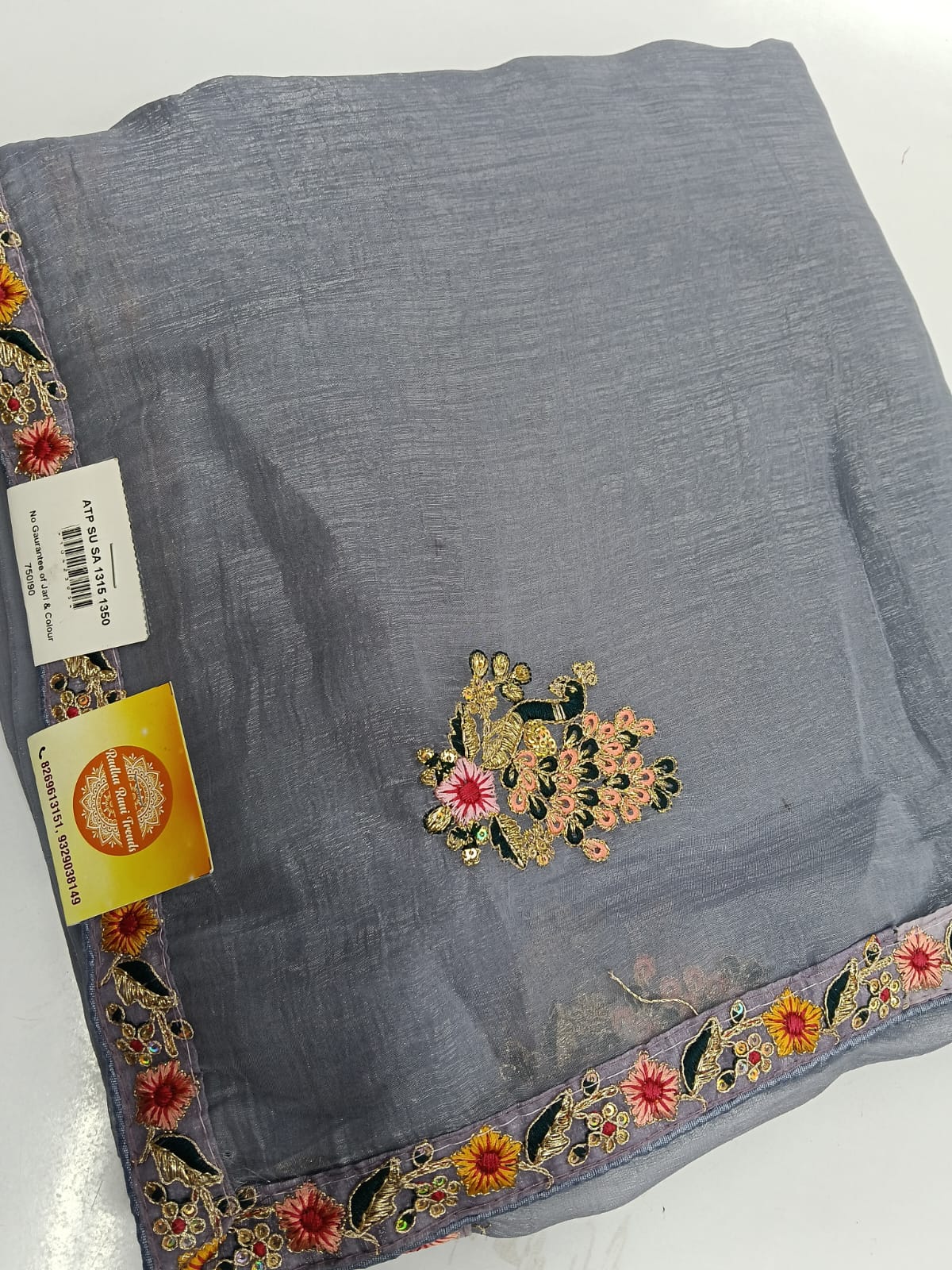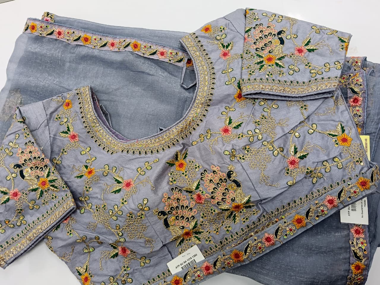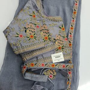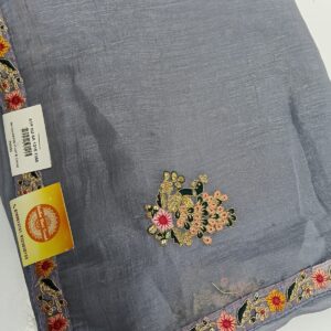 Lavender soft tissue designer saree with embroidery border works is paired up with floral blouse having embroidery works for sleeves.